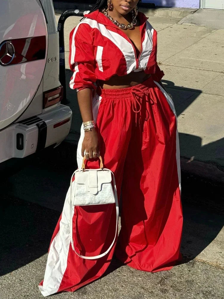 NONECN Patchwork Womens Zipper Sweatshirt Jacket And Wide Leg Pants Set